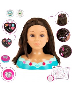 Meet "Mia," the 27 cm hairdressing head with washable, combable brown hair, perfect for little stylists! The set includes a dermatologically tested cosmetic kit with lip gloss, eye shadow, and blush, plus hair accessories like clips, beads, and strands. Everything comes in a cute heart-shaped box with styling tips and more.
