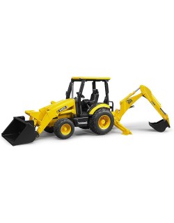 The JCB MIDI CX Backhoe Loader looks just like the real machine. It has a front shovel that lifts and scoops, and a back digger that can dig into the ground. The seat turns so the driver can use both tools. It has strong rubber tires and can pull trailers too. Perfect for fun construction play!