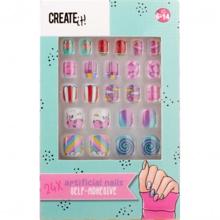 The Create it! Candy Explosion Artificial Fingernails bring a burst of color and fun to every look with their playful, candy-inspired designs. Created to spark creativity and self-expression, these easy-to-use self-adhesive nails offer a mess-free way for kids to explore style and imagination. Age 6+