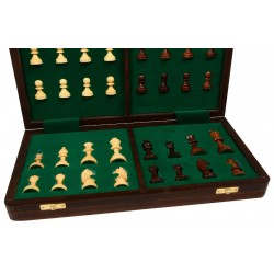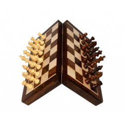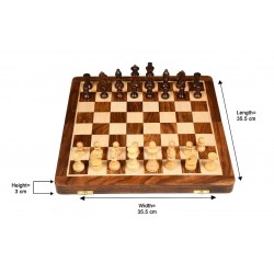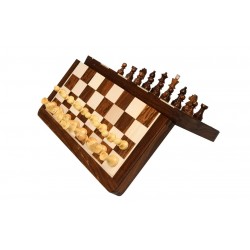 This Sheesham Wood Folding Magnetic Chess Set features a durable design with a dark Sheesham and light Box Wood board. It includes 32 pieces, a folding board that becomes a 14" x 7" box, and punched slots for easy storage. The King stands at 2.75" tall and the set weighs 1540 grams.