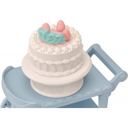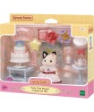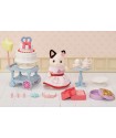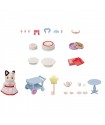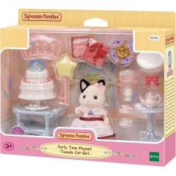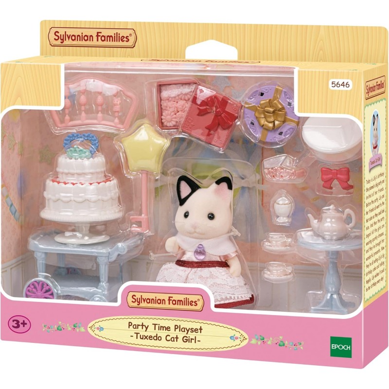 The Party Time Playset -Tuxedo Cat Girl- includes Lily in a party dress, a two-tier cake with decorations, a movable cart, and fun accessories like a star balloon and Alice band. It comes with everything needed for standalone play