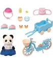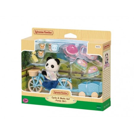 This set includes a figure with accessories for standalone play. The bicycle connects to the cart for carrying a baby or luggage. The figure can wear adjustable roller skates, a helmet with a strap, and a backpack that holds a flask.