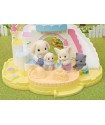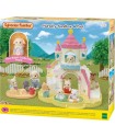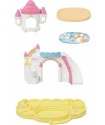 The Nursery Sandbox & Pool Set is a fun addition to the nursery, featuring Thyme, the Flora Rabbit cradled baby. The set includes a castle with peek-out windows and a big slide, plus adorable toys like a bucket, scoop, and ball. It also has a pool with swim rings that fit both regular and cradled babies, offering lots of imaginative play possibilities.