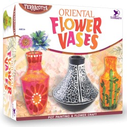 Tissue papers in assorted colours; paper stems 6; instruction manual; 3 terracotta pots which are shaped like those from china and japan; use your imagination and once done with painting one can arrange flower made out of crepe paper provided