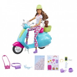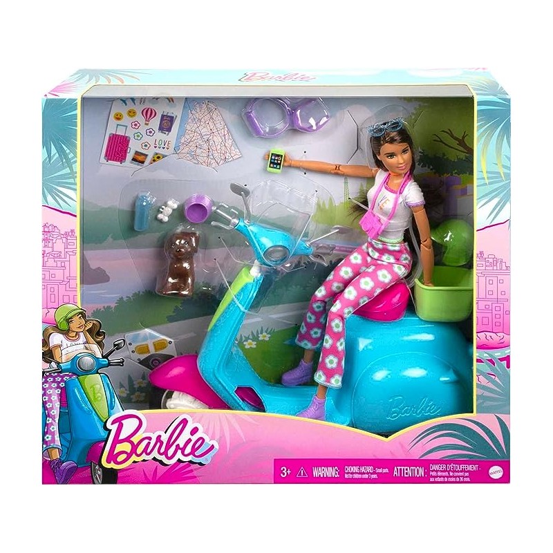 Each poseable doll wears a swim-casual outfit and comes with a towel, pet puppy, and beach-themed accessories.