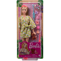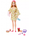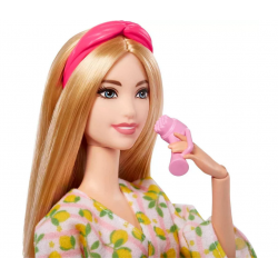 This blonde Barbie doll wears a comfy chic bathrobe with a lemon print! A towel, headband and slippers provide extra touches of cozy style