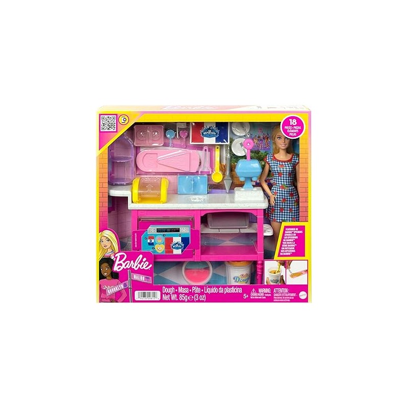 Includes Barbie doll wearing fashion and shoes, pooping puppy, peeing puppy, two smaller puppies, water bottle, food dish, three bones, one blanket and one color-change 'newspaper.'