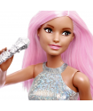 Barbie doll wears a vibrant pink utility-style jumpsuit with white boots. Her sleek brown hair is pulled into a high pony!