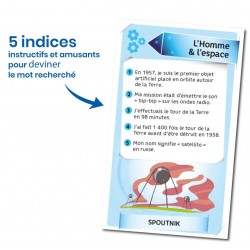 Avec Enigmes - Espace, tentez d’être le plus rapide à deviner les objets célestes et découvertes spatiales qui se cachent derrière 5 indices instructifs et amusants. Faites preuve d’adresse en lançant le jeton sur le plateau pour tenter de gagner plus de cartes Enigmes - Espace !