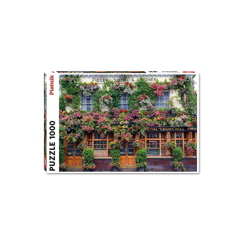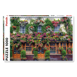 This 1,000 piece jigsaw puzzle depicts a classic London pub with gorgeous vines of flowers all over the front of the building. A very inviting site.
