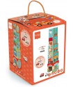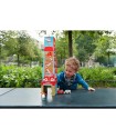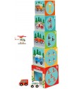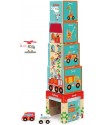 The tower is made of sturdy, durable cardboard, while the vehicles are made of wood. 5 cardboard cubes combined with 3 wooden vehicles in a set: fire truck, ambulance and helicopter.