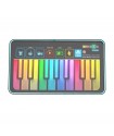 The iDance Musika Piano features a 17-key touch-sensitive keyboard with 3 premium sounds (grand piano, strings, organ), 3 drum pads with 9 sounds, 13 audio recordings (including classical), a guided performance function, and a mode combining percussion, piano, and classical melodies.