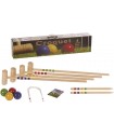 4 player croquet set includes four 32" long mallets, four (75 mm) tough resin balls, 2 pegs, 10 wickets, official playing instructions
