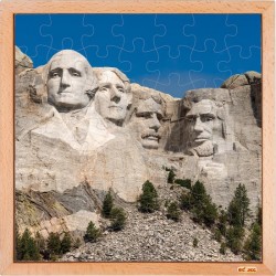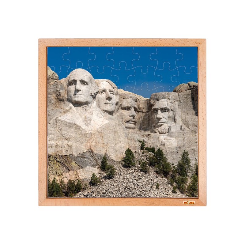 The Educo USA puzzle; Mount Rushmore is a large jigsaw puzzle entirely made of wood. This large and beautifully illustrated landmark-themed jigsaw puzzle is forty by forty centimetres and comprises of twenty five sturdy wooden puzzle pieces set in a beechwood inlay board and depicts the famous Mount Rushmore situated at the Black Hills in Keystone, South Dakota, the United States of America