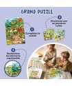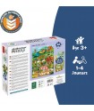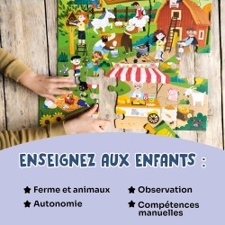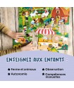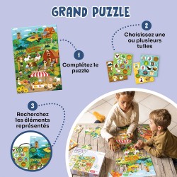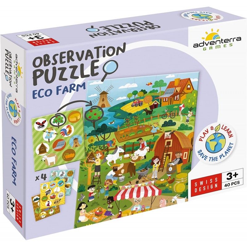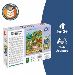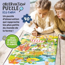 This vibrant 40-piece puzzle introduces kids to the world of green farms! Once assembled, children can test their observation skills by finding all 60 eco items on the 4 player cards. A fun, educational way to learn about farm animals and nature. Includes a full-size poster for extra play and learning.