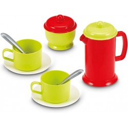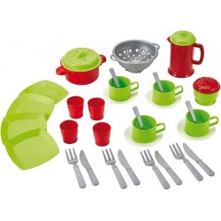 This set includes a vinyl bag, 4 plates, cutlery, cups, a teapot, stewpan, and draining board—everything needed for a pretend walk and dinette play. Ecoiffier toys help kids develop skills by mimicking adult activities.