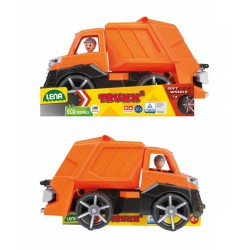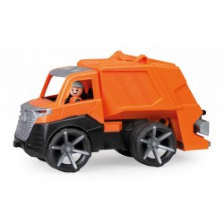 LENA® TRUXX² Garbage Truck with soft wheels, galvanized steel axles, and a driver's cabin that opens for play. Features a lockable waste container, dustbin, and a LENA® play figure. Length: 33 cm. Suitable for indoor and outdoor play.