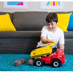 COLD-ROLLED STEEL Made with steel - Tonka tough and designed to last! This sturdy truck is 17" long with a movable truck bed built for the mightiest of hauls. Load, haul then tilt to dump sand, rocks or anything else aspiring builders imagine.