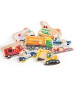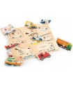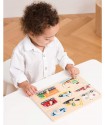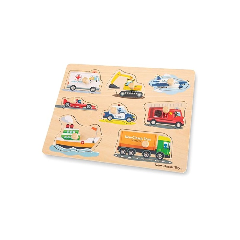 Explore the world of transportation and vehicles with this wooden peg puzzle from New Classic Toys. Featuring an ambulance, an excavator, an airplane, a race car, a police car, a fire engine, a boat and a truck.
