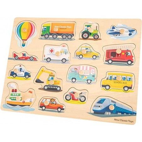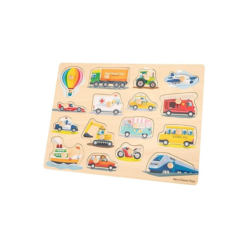 Explore the world of transportation and vehicles with this wooden peg puzzle from New Classic Toys. Featuring a hot air balloon, a truck, a tractor, an airplane, a race car, an ambulance, a taxi, a fire engine, a police car, an excavator, an ice cream truck, a school bus, a boat, a car, a motorcycle and a train.